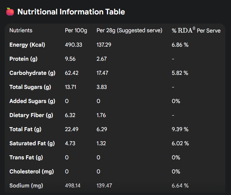 A serving offers 17.47g of carbohydrates, giving you quick and sustained energy—perfect for work, travel, or pre-workout munching.